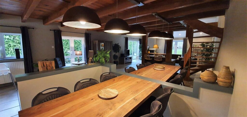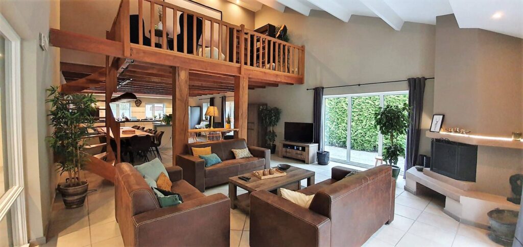 Ruime ontvangsthal met toegang tot toilet en 2 slaapkamers. Grote woonkamer van 80 m² met open haard, flat screen TV (satelliet ontvangst) en DVD, open keuken met granietenblad incl. alle inbouwapparatuur. Deur naar inpandig verwarmd zwembad met grote doucheruimte. Meer info >>